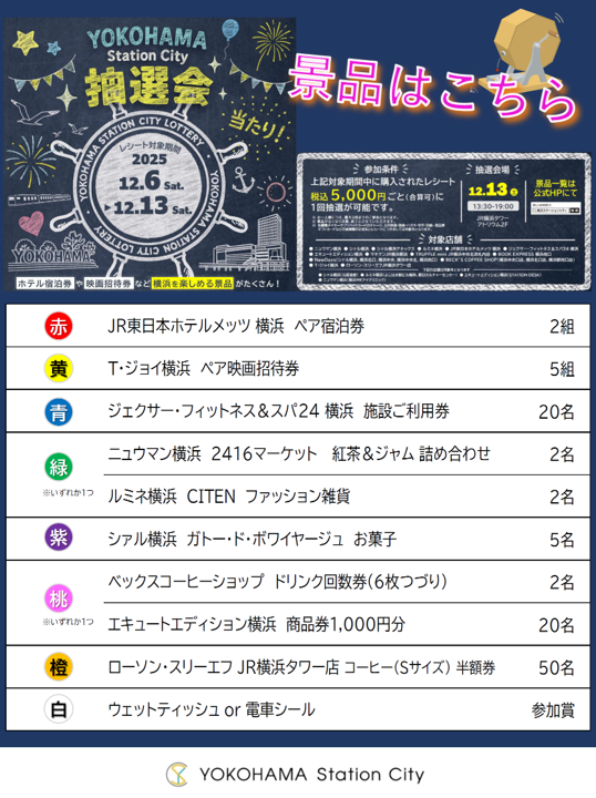 上記対象期間中にYOKOHAMA Station City内の対象店舗で購入されたレシートを、抽選会場にお持ちいただくと、税込5,000円ごとのレシート(合算可)で1回、抽選会に参加可能です。
