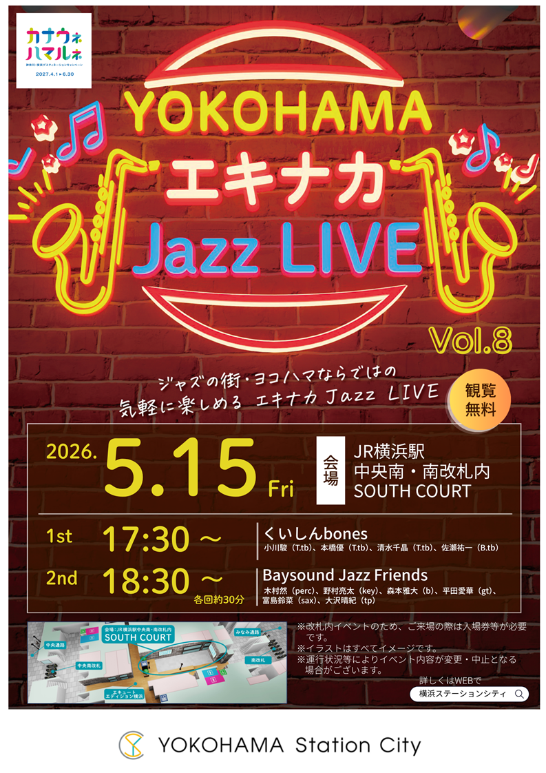 2026年5月15日(金)、JR 横浜駅 中央南・南改札内 「SOUTH COURT(サウスコート)」にて「YOKOHAMA エキナカ Jazz LIVE Vol.8」を開催いたします!
